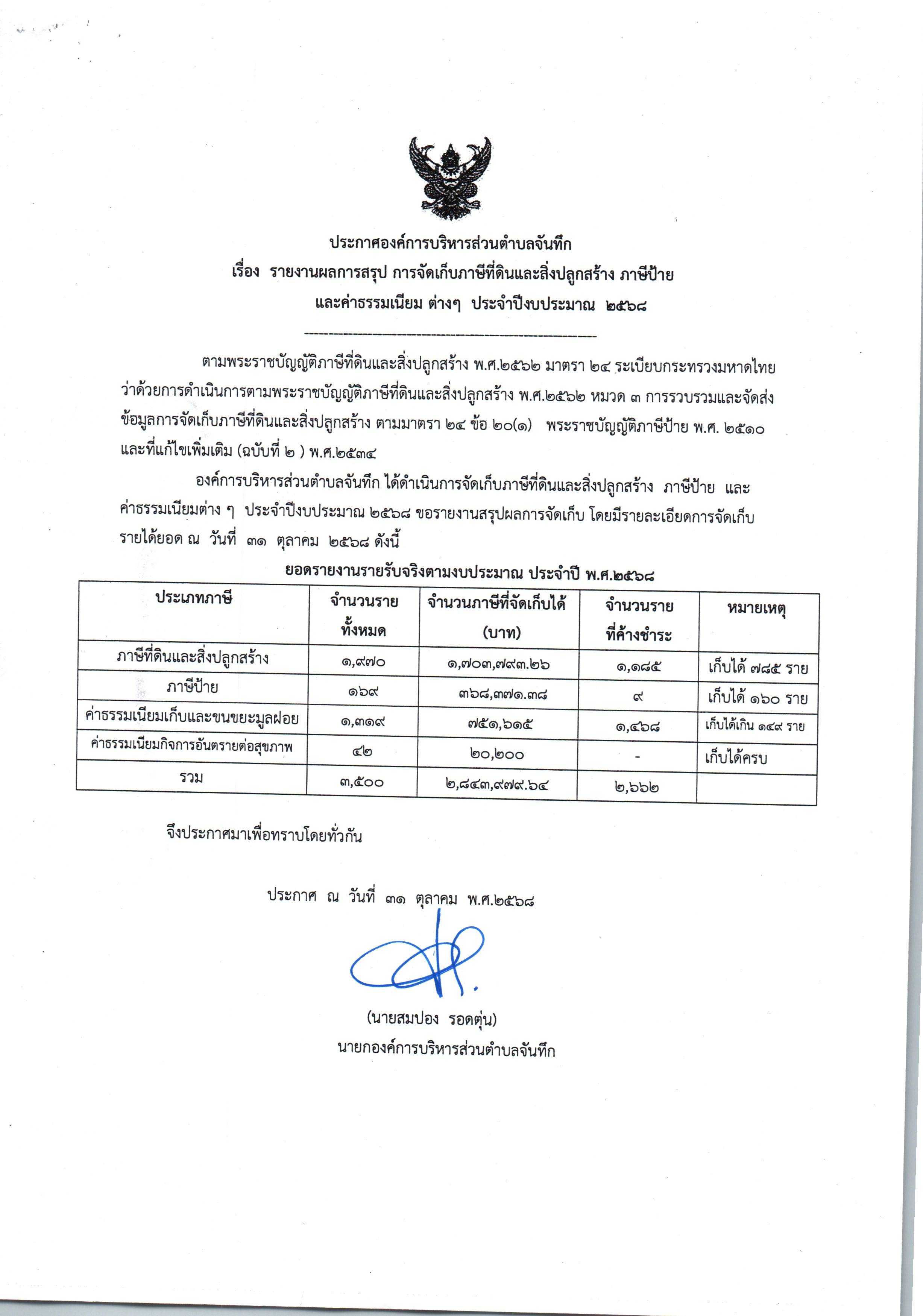 ชื่อเรื่อง : ประกาศ รายงานผลการสรุป การจัดเก็บภาษีที่ดินและสิ่งปลูกสร้าง ภาษีป้าย และค่าธรรมเนียม ต่างๆ ประจำปีงบประมาณ 2568