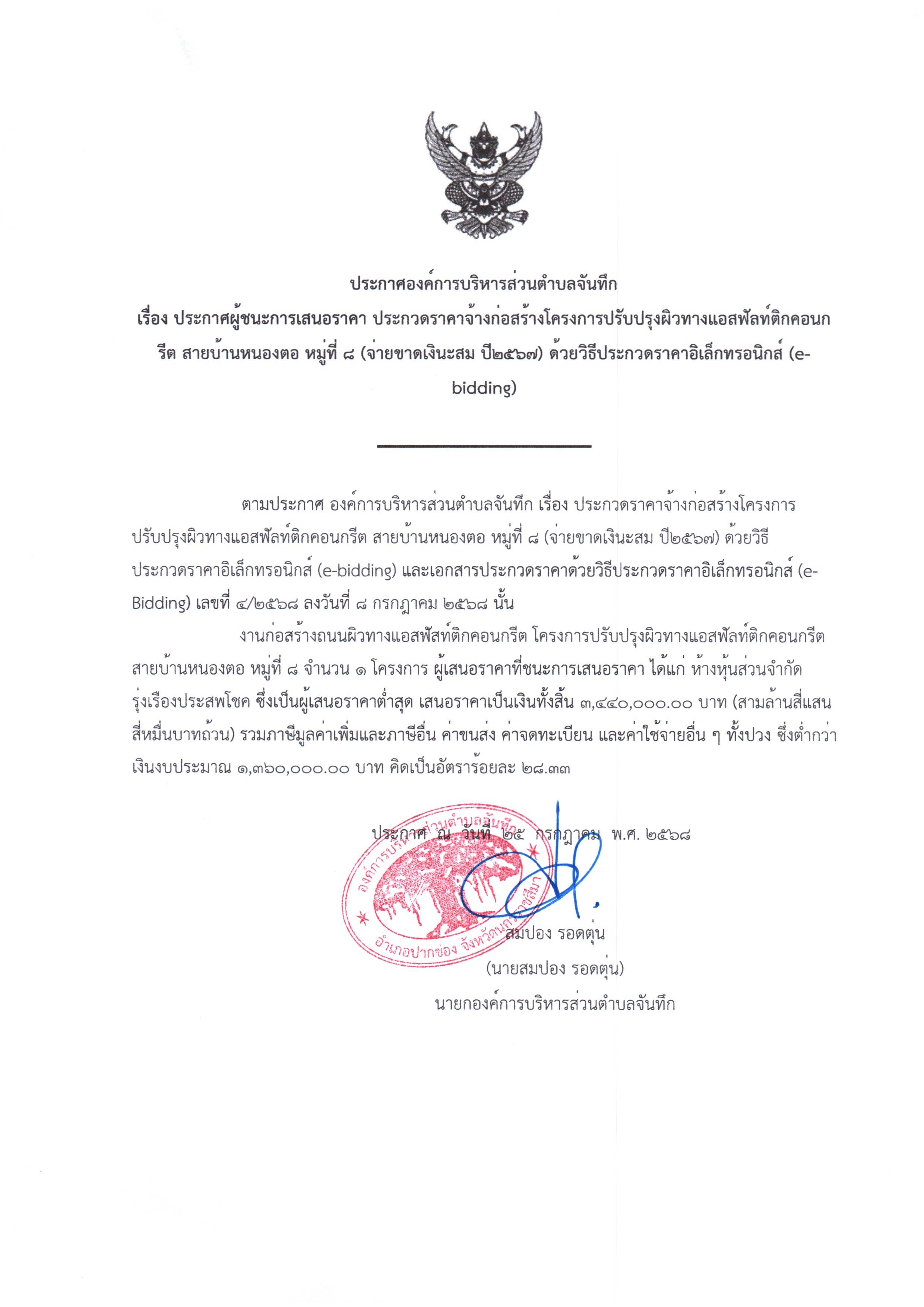 ประกาศผู้ชนะการเสนอราคา ประกวดราคาจ้างก่อสร้างโครงการปรับปรุงผิวทางแอสฟัลท์ติกคอนกรีต สายหนองตอ หมู่ที่ 8 (จ่ายขาดเงินสะสม ปี2567) ด้วยวิธีประกวดราคาอิเล็กทรอนิกส์(e-bidding)