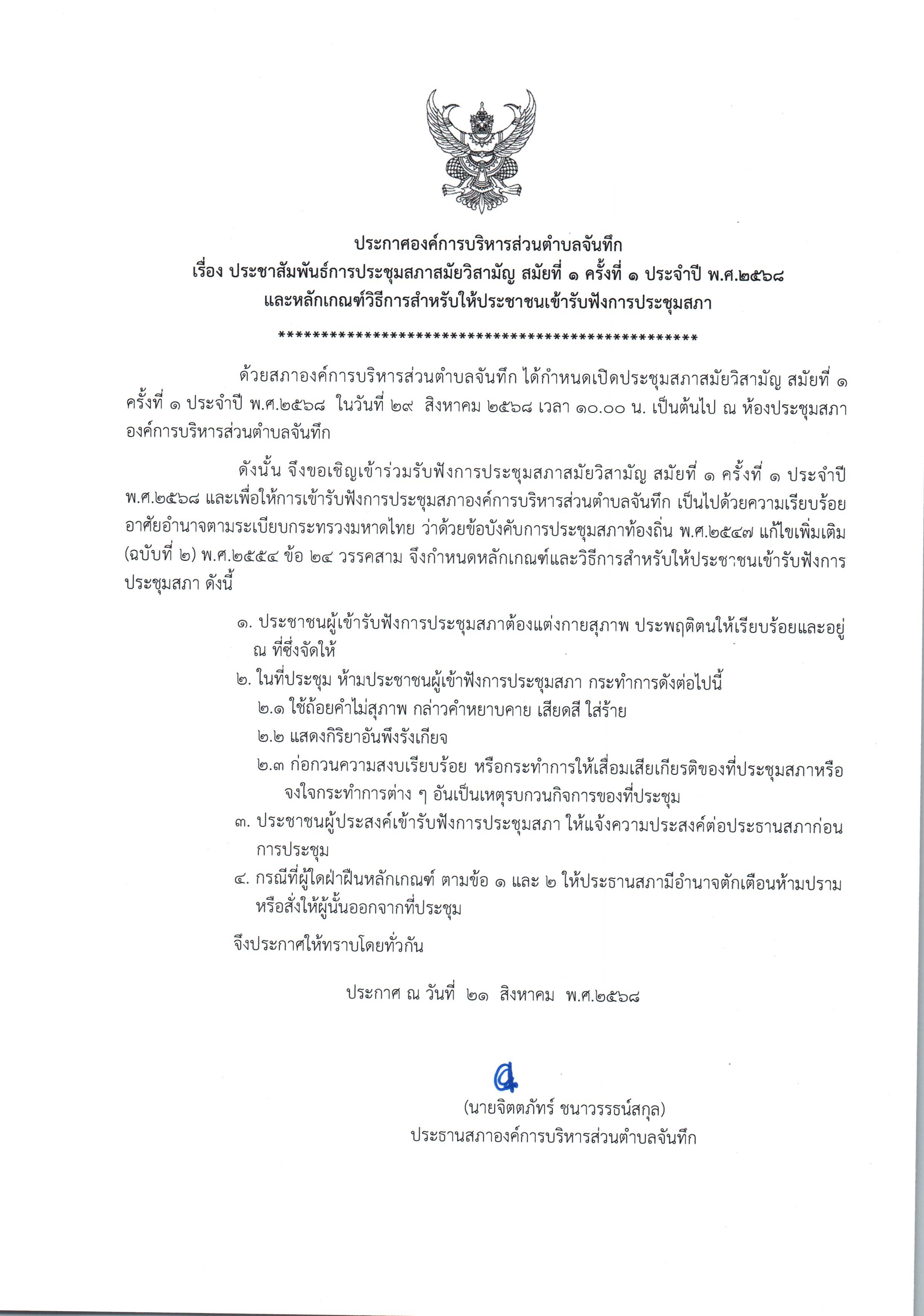 ชื่อเรื่อง : ประกาศ ประชาสัมพันธ์การประชุมสภาสมัยวิสามัญ สมัยที่ 1 ครั้งที่ 1 ประจำปี พ.ศ.2568 และหลักเกณฑ์วิธีการสำหรับให้ประชาชนเข้ารับฟังการประชุมสภา